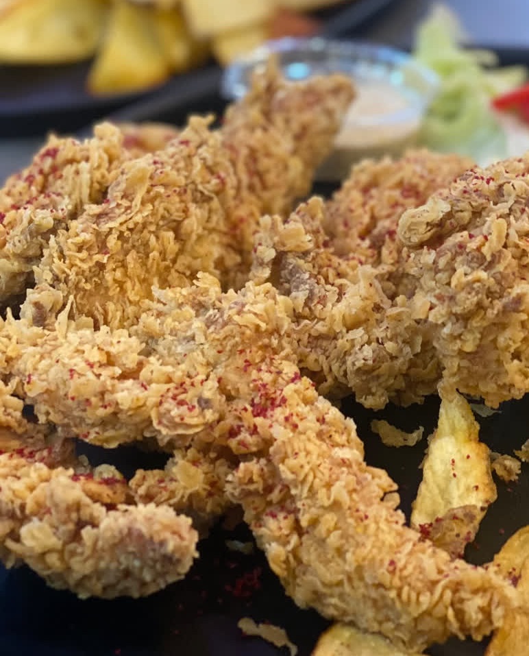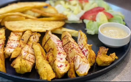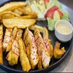 350گرم فیله مرغ سوخاری شده،پنیر گودا بیکن،سس مخصوص باریژ،دورچین،به همراه یک پرس سیب زمینی تنوری